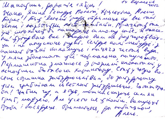 “Вельмі рады быў атрымаць ад вас столькі цяпла і пазітыву, -- піша Алесь. -- Прачытаў там усё, што хацеў бы пажадаць самому сабе. Я таксама ўзгадваю вас і жадаю вам не расчароўвацца і не апускаць рукі. Сыйдзе калі-небудзь і з нашай рэчкі каламуць, і пацячэ чыстая вада... Стаў гэтай восенню страшна зайздрослівым, бо зайздрошчу ўсім грыбнікам светлай зайздрасцю... Гэта ж тэрба! Грыбны год, а я тут можна сказаць, сам як грыб, мадзею. Але ўсяго не ўхопіш... ”