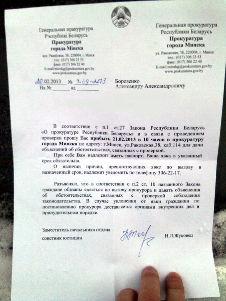 У сераду журналіст наведаў пракуратуру г. Мінска, дзе з ім пагутарыла намеснік начальніка аддзела на наглядзе за выкананнем заканадаўства і законнасцю прававых актаў, саветнік юстыцыі Наталля Жукавец.