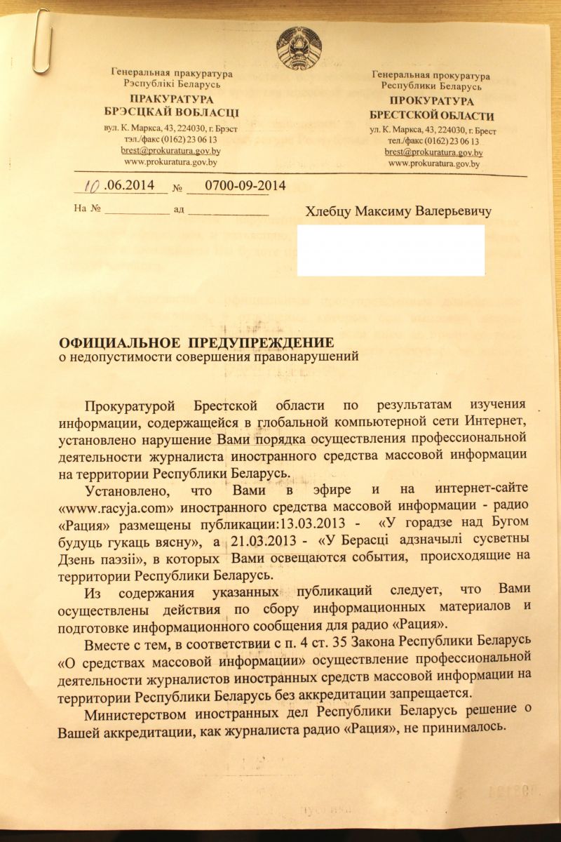 Пракуратура Брэсцкай вобласці вынесла пісьмовае папярэджанне незалежнаму журналісту Максіму Хлябцу за супрацоўніцтва з замежным СМІ – «Беларускім Радыё Рацыя» – без акрэдытацыі.