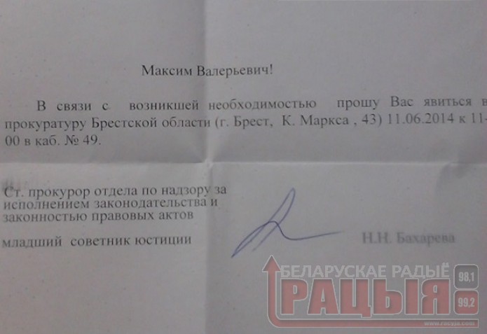 Старшы пракурор аддзела па наглядзе за выкананнем заканадаўства і законнасцю прававых актаў Ніна Бахарава ўручыла яму пісьмовае папярэджанне, датаванае 10-м чэрвеня і падпісанае намеснікам пракурора Брэсцкай вобласці Аляксандрам Точкам.