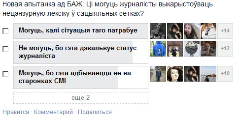 Паводзіны ў сацыяльных сетках раз-пораз робяцца прадметам дыскусій унутры журналісцкай супольнасці. Нядаўняя апытанка ў БАЖаўскай Facebook-суполцы закранула даволі спецыфічны аспект гэтых паводзінаў – выкарыстанне ненарматыўнай лексікі журналістамі. Адметна, што большасць удзельнікаў апытання пакінула за сабою права ўжыць “моцнае слоўца” ў выпадку неабходнасці.