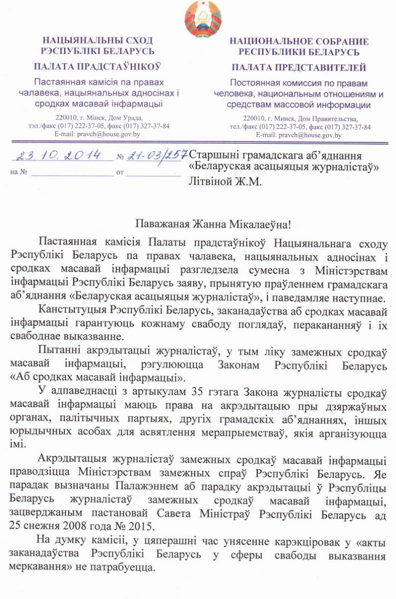 Нагадаем, што 26 верасня бягучага года ГА “Беларуская асацыяцыя журналістаў” звярталася да Генеральнага пракурора, міністра ўнутраных спраў, старшыні Камісіі па правах чалавека, нацыянальных адносінах і СМІ Палаты прадстаўнікоў Нацыянальнага сходу, а таксама Вярхоўны суд з патрабаваннем спыніць ціск на журналістаў-фрылансераў, а таксама прывесці заканадаўства Беларусі у сферы свабоды выказвання ў адпаведнасць з Канстытуцыяй і міжнароднымі прававымі актамі.