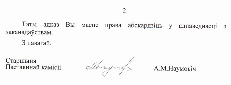 Зварот грамадскага аб’яднання парламенцкая камісія разглядала сумесна з Міністэрствам інфармацыі Беларусі, пра што паведамляецца ў дакуменце. На думку сябраў камісіі, у цяперашні час унясенне карэкціровак у акты заканадаўства Беларусі ў сферы свабоды выказвання меркавання не патрабуецца.
