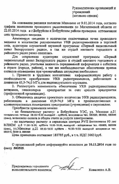 “Аналізуючы звесткі пра колькасць адключаных кропак праваднога вяшчання і колькасць рэалізаваных УКХ-прыёмнікаў у гандлёвай сетцы, аўдыторыя слухачоў гукавой праграмы “Першы нацыянальны канал Беларускага радыё”, а таксама студый мясцовага гарадскога і раённага радыё рэзка знізілася”, – гаварылася ў яго лісце кіраўнікам мясцовых арганізацый і ўстановаў. (Тэкст ліста прыводзіцца без змяненняў.)