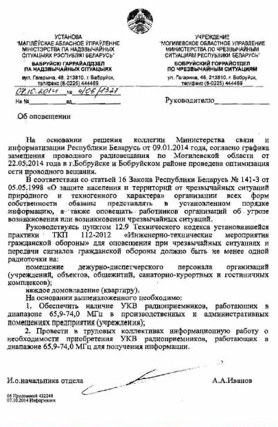 У кастрычніку 2014 года тагачасны в.а. начальніка бабруйскага гаррайаддзела МНС Аляксей Іваноў падпісаў распараджэнне пра ўсталяванне УКХ- радыёпрымачоў у кожным домаўладанні (кватэры) і адміністрацыйным памяшканні.
