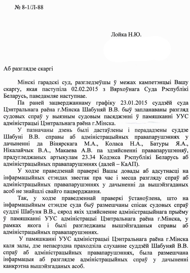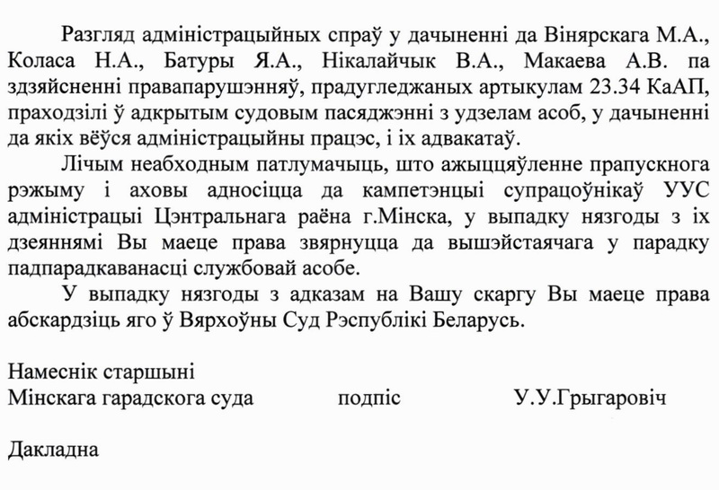 Нягледзячы на гэта, у сваім адказе намеснік старшыні Мінскага гарадскога суда Уладзімір Грыгаровіч паведамляе, што разгляд адміністрацыйных спраў у дачыненні да актывістаў праходзіў у адкрытым судовым пасяджэнні, а інфармацыя пра гэта нібыта была размешчана каля залы.