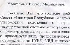 Журналист «Бобруйского курьера» Виктор Качан получил любопытный ответ на свое заявление в Бобруйское УВД. В заявлении он просил предоставить ему информацию – числится ли он в компьютерной базе милиции как осужденный за административное правонарушение.